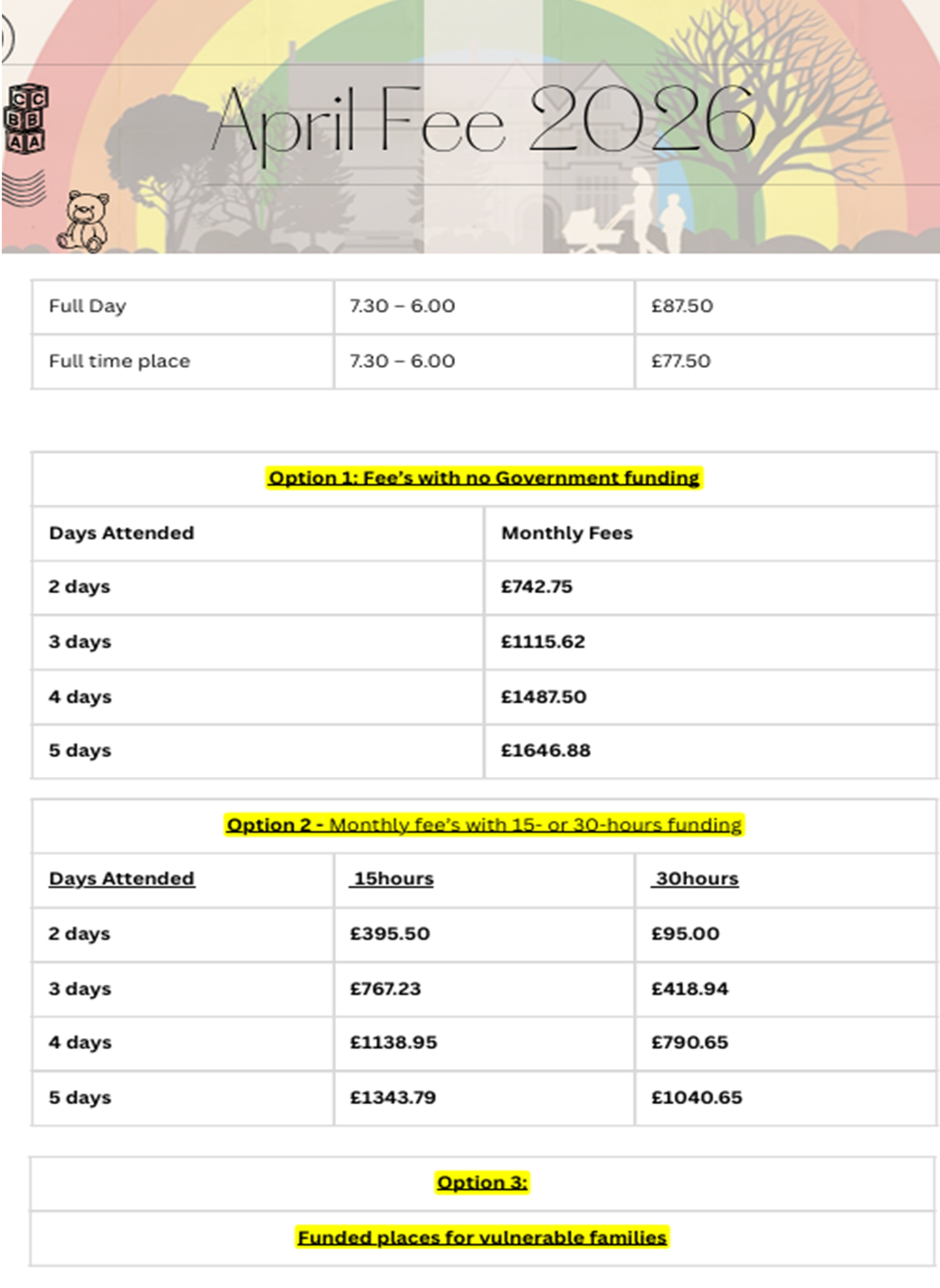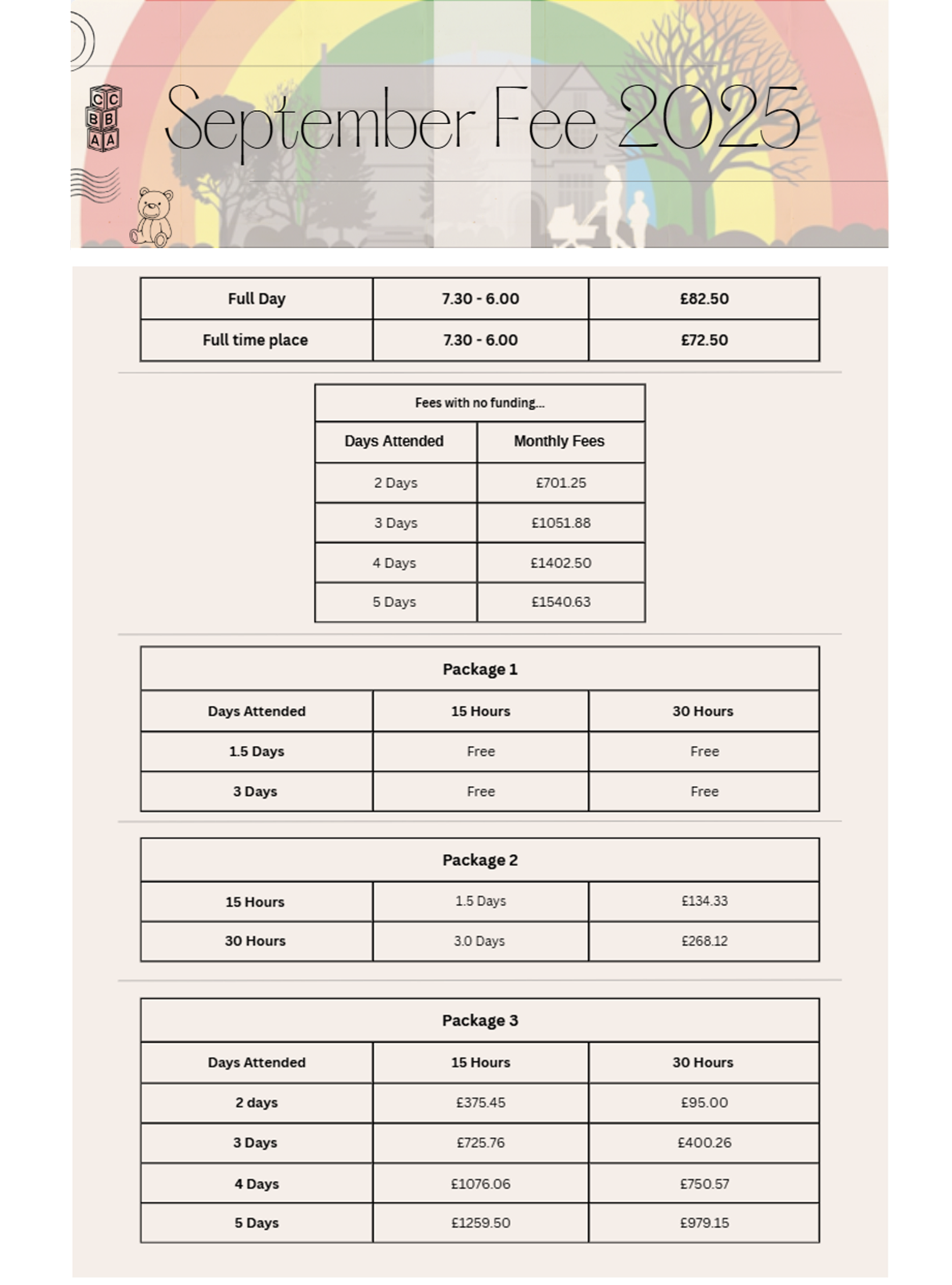 We accept payments via bank transfer, Tax free childcare scheme and childcare vouchers.